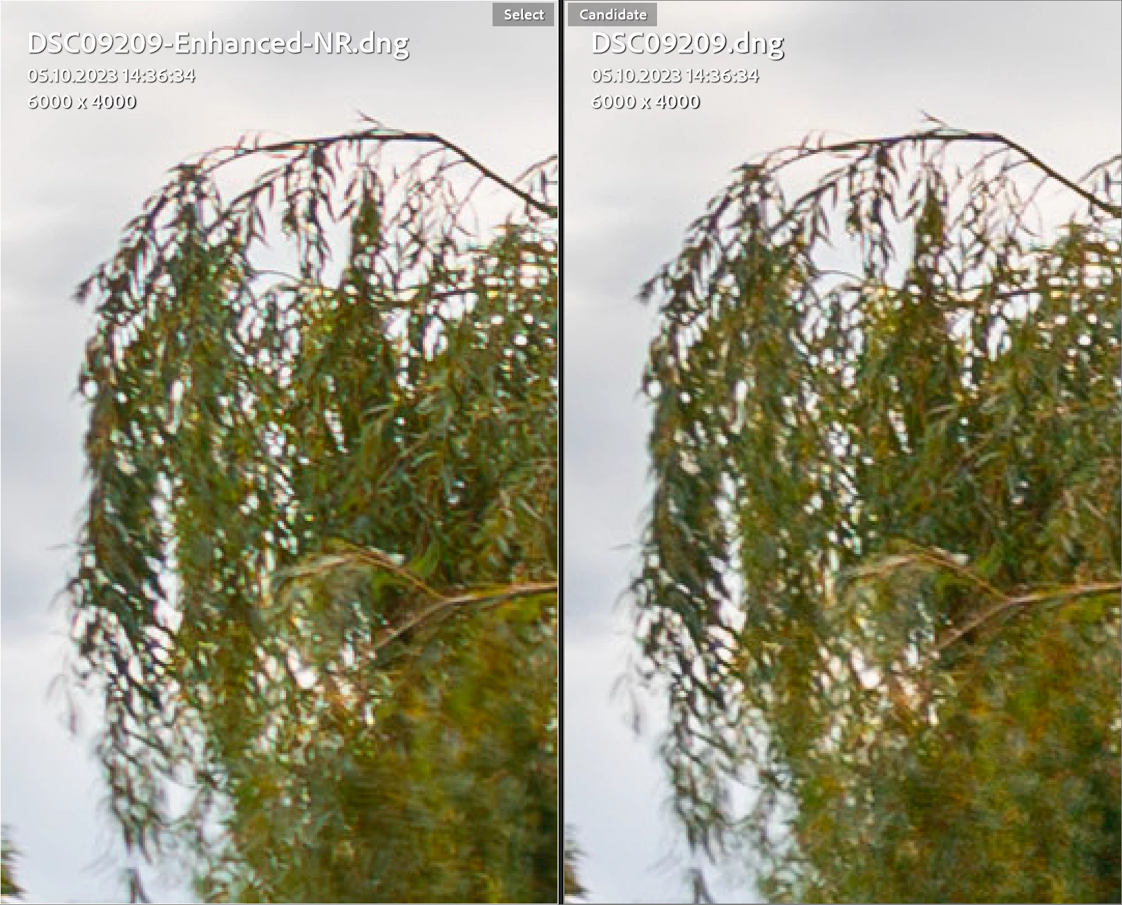 Denoise AI increases chromatic aberrations. "Remove chromatic aberrations" is enabled and "built-in lens profile" is used on both photos. The amplification of aberrations by denoise varies from lens to lens. In the case of Tamron 17-28 F2.8 Di III, they are very visible. For the Tamron 28-75 F2.8 A063 and 70-180 2.8 A056 they are less visible or not visible at all.