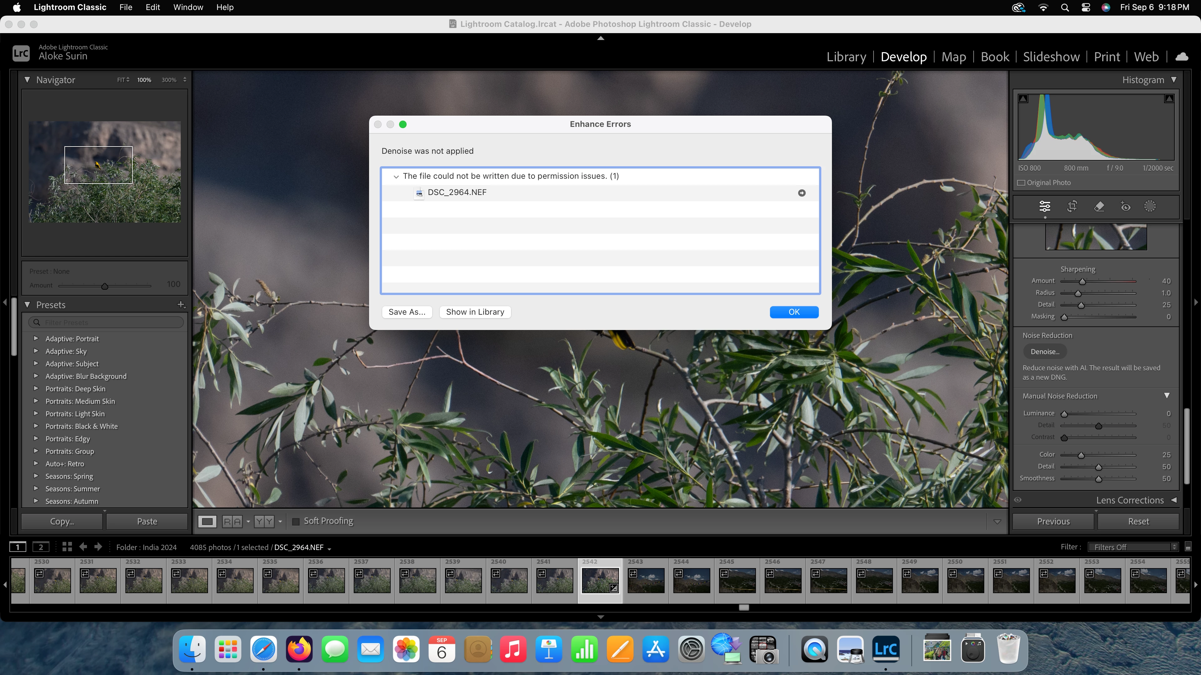 After clicking the Enhance button on the Denoise pop up window, I keeep getting this message : "The file could not be written due to permission issues". I have the latest version of Lightroom Classic and it is up to date. Am using it on my Mac Mini2. I never had this problem on my PC running Windows 11.