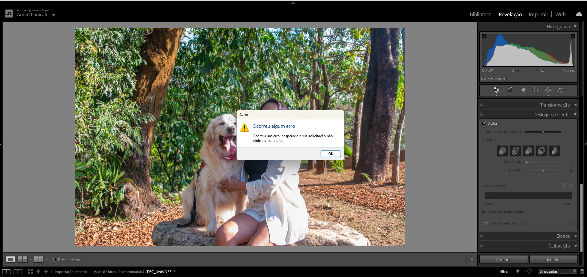 Ao ativar o DESFOQUE DE LENTE , aparece uma mensagem dizendo: ERRO INESPERADO.