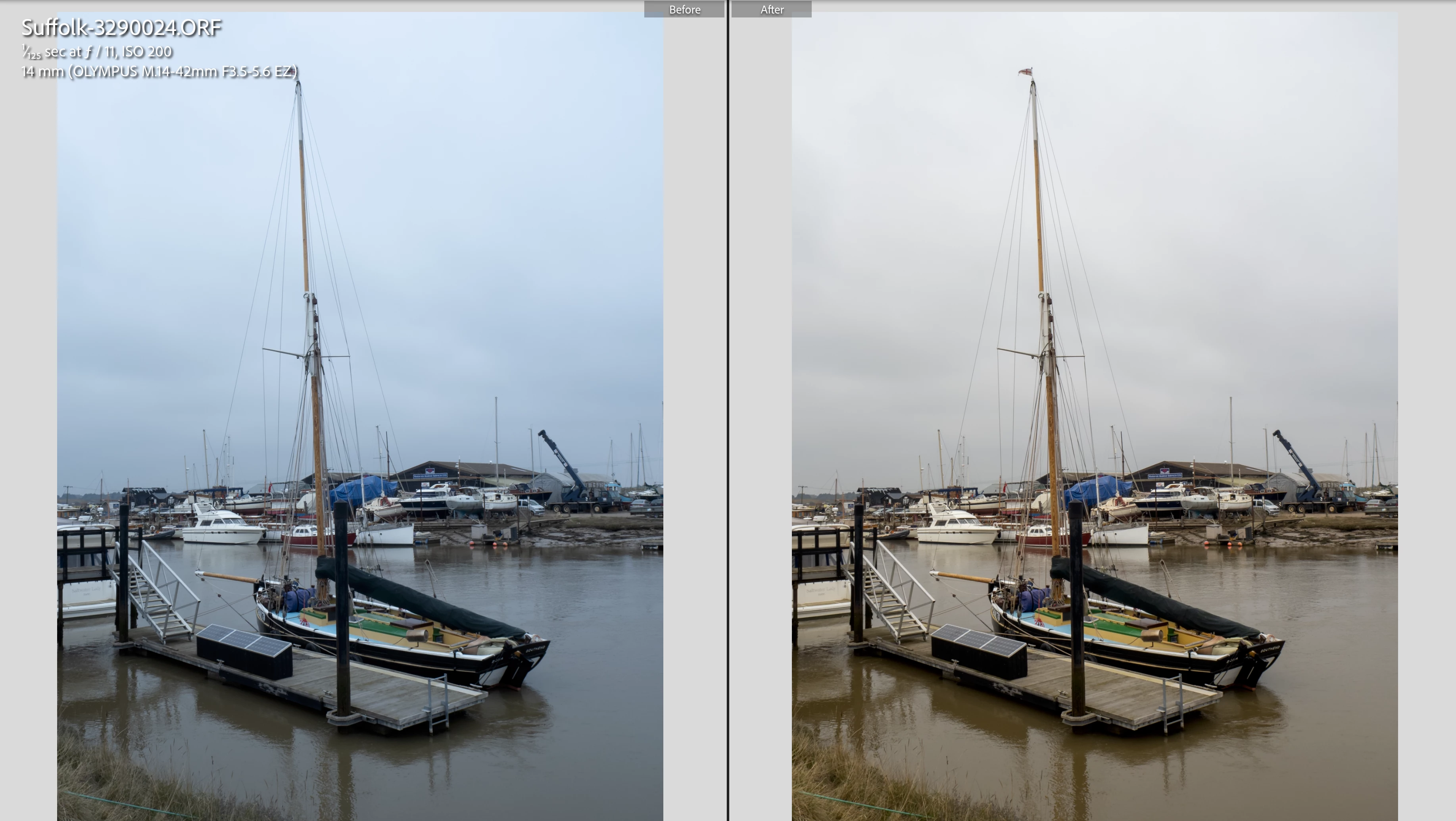 Develop Module - Before and After view comparison, Before has a corrupted white balance