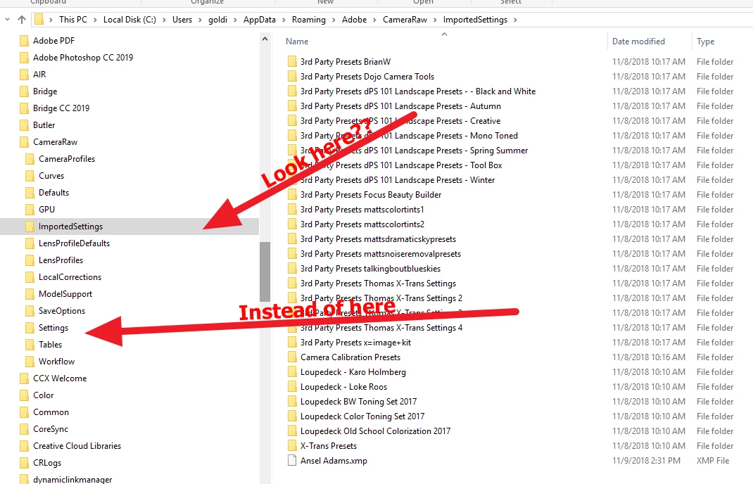 I had backed up all of my develop presets to an external drive and thought I had imported them properly but I am missing a bunch. When select Show Lightroom Presets from preferences, it shows to folder as being C;/Users/bians/appdata/roaming/adobe/cameraRaw/settings The presets in this location are all in subfolders but the only folder that shows in Lightroom is the one called User Presets. Why is Auto Fix, Improve Photography Landscapes etc etc not appearing Lightroom?