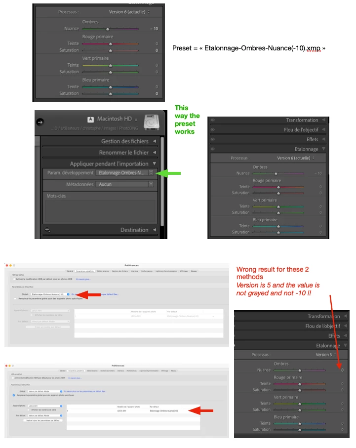 Mon preset d'importation ne met pas à jour les valeurs d'Etalonnage (Version Processus et Nuance) quand il est spécfié dans les paramètres d'importation (Lightroom Classic/Préférences.../Paramètres prédéfinis).