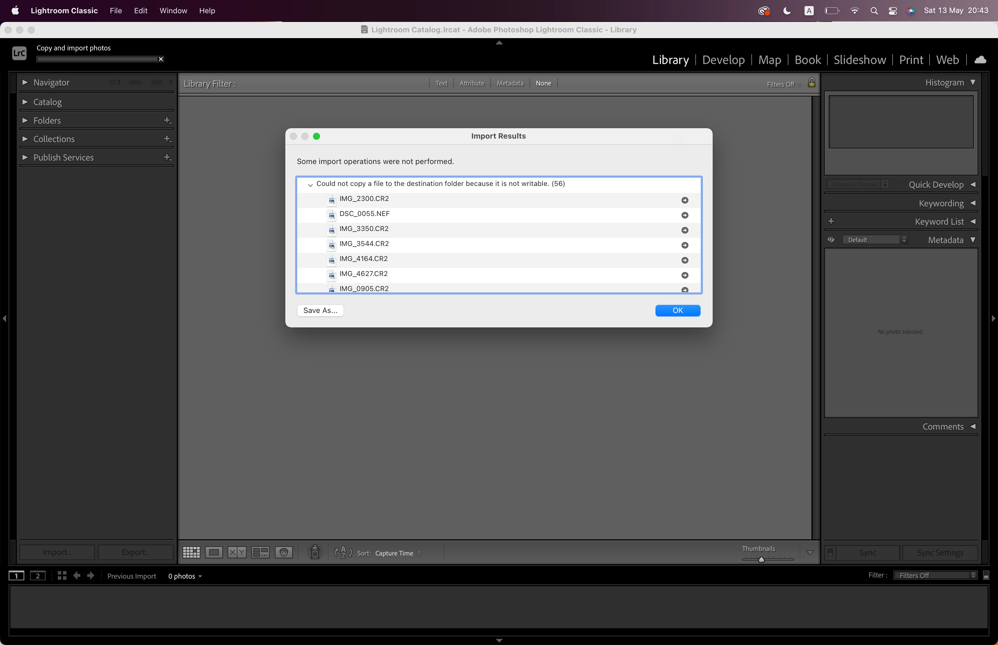 The error message is clear. You have chosen a destination that Lightroom has no permissions to write to, or is not writable for MacOS (like an NTFS-formatted disk, for example). Without you giving us more information, that is all I can say.