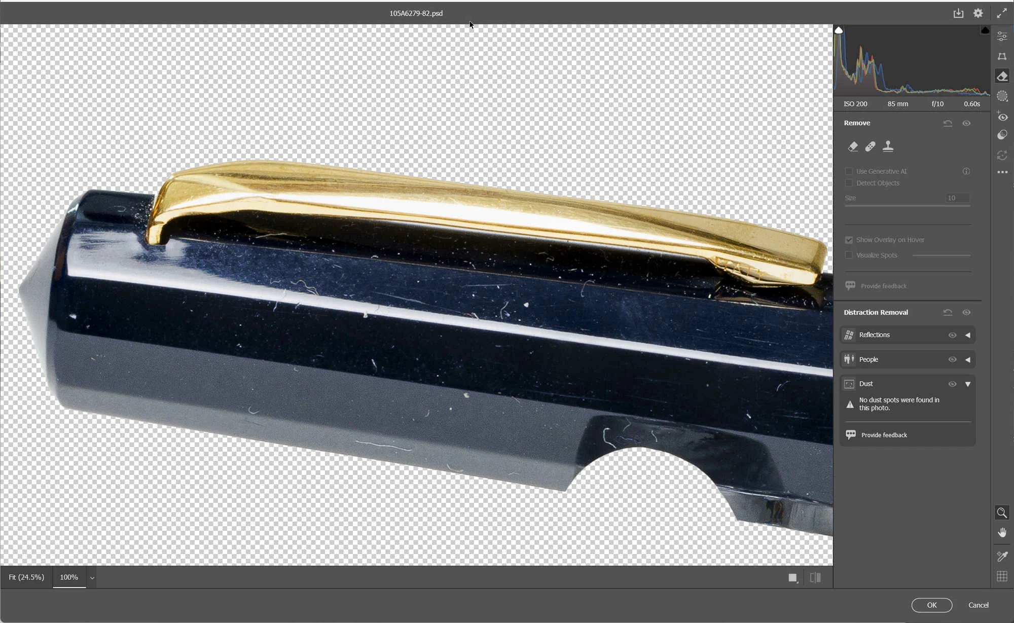 I tried to remove the dust and specks on a black fountain pen photograph, but it said this image has no dust spots. There were plenty! I am not sure what I did wrong.