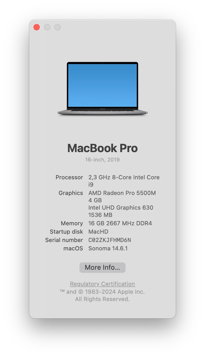 The Graphics Processor is AMD Radeon Pro 5500M 4 GB; Intel UHD Graphics 630 1536 MB