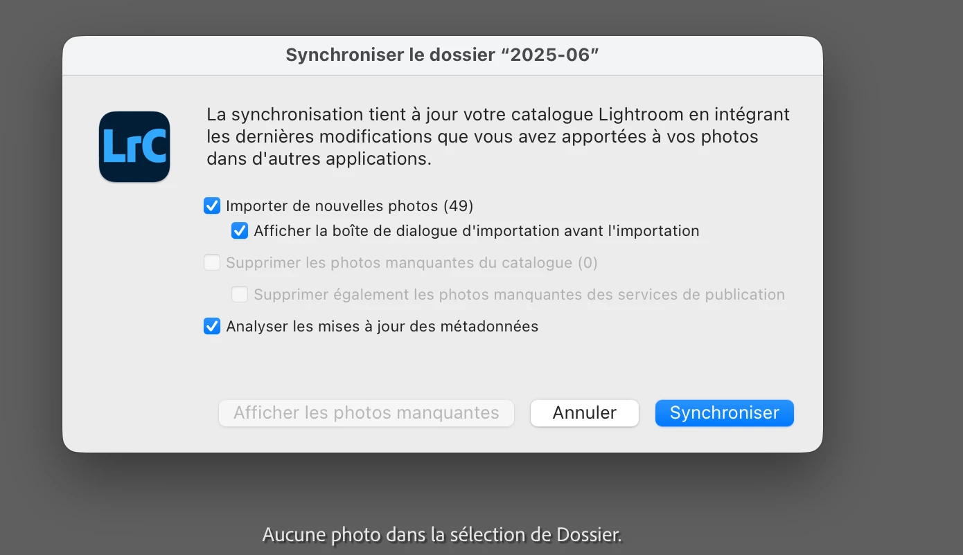 Bonjour, depuis la récente mise à jour LrC 15.0 sur MacOS 26.0.1, plusieurs dossiers apparaissent vides. Pourant les photos sont bien dans les dossiers. Si je tente de synchroniser un dossier vide avec la boite de dialogue, les photos sopnt visibles mais grisées car non repérées comme nouvelles photos.