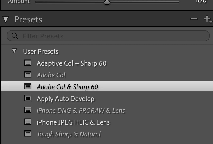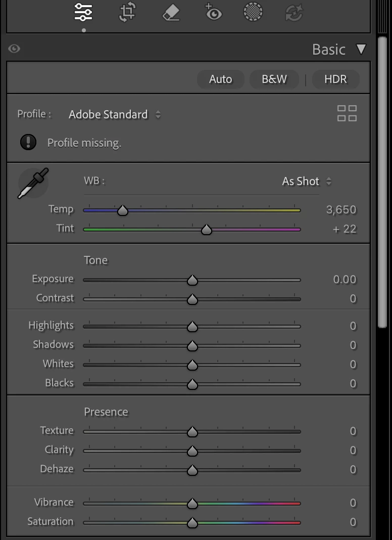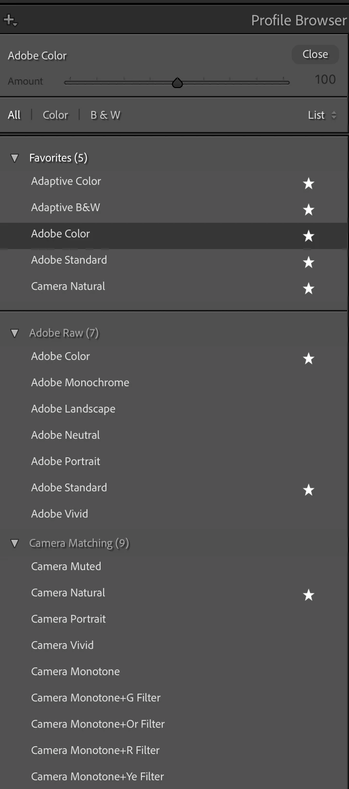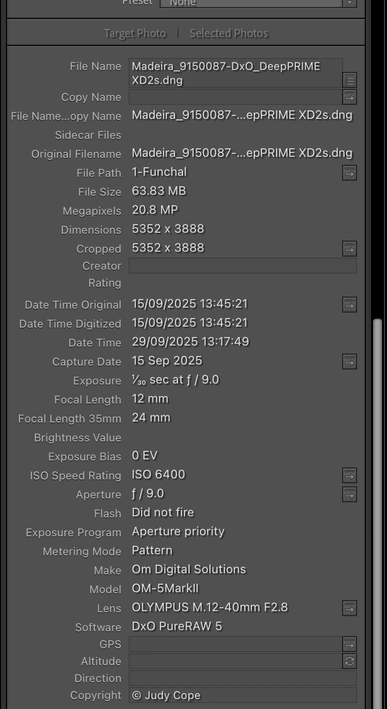 The original ORF file has the profile – Adobe Color. When the DNG is automatically imported back into Lightroom the profile has changed to Adobe Standard and there is a message: !Profile missing. The profile browser only has four options: Adaptive Color, Adaptive B&W, Color and Monochrome. It is missing all of the Adobe and Camera matching choices usually available. In the lefthand panel under Presets, the preset I had used to import the original ORF file is now greyed out and in italics.