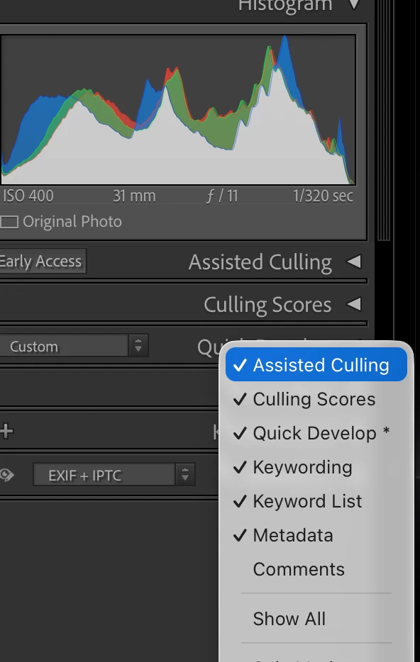 • In Lightroom Classic, Assisted Culling is available in the Library module and Import dialog.
