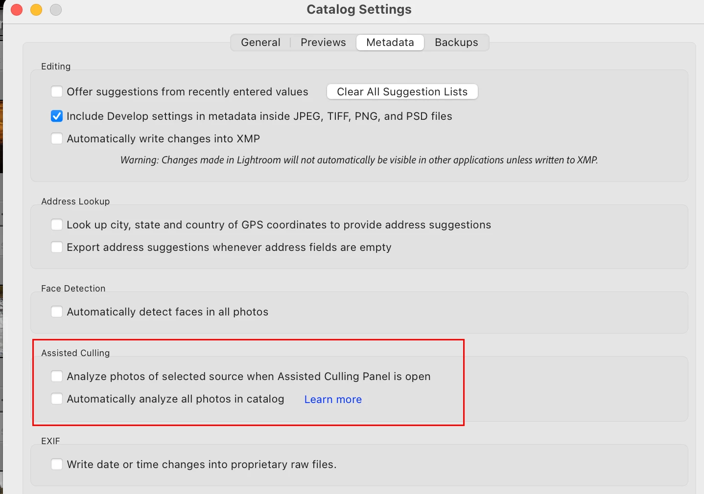 -In the ‘Catalog Settings’, both ‘Assisted Culling’ boxes are checked.
