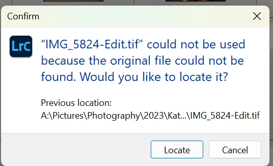 The file that it is trying to find is in the same folder as well, Lightroom is just not able to "locate" it for some reason.