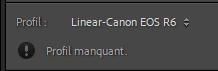 Maintenant je suis passé au R6mk3. J'ai donc imorté et installé le profil adequat. Il est disponible dans camera raw et aussi dans le module développement de LRc mais il n'est pas disponible à l'importation des photos. De plus comme je n'ai pas le bon profil je marque l'option "sans profil" à l'importation mais LRc semble appliquer le profil R6 (ancien) tout en spécifiant après dans le module dev qu'il est manquant