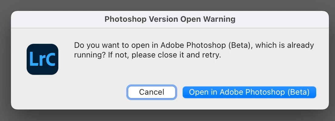 I have LrC 13.1 and Ps 25.4.0 on my MacBook Pro M1 (2021) running Mac OS 14.2.1. I have uninstalled Ps (Beta) because of the following. Every time I try to edit an image in PS [Edit in… Photoshop 2024] I get a popup window: Do you want to open in Adobe Photoshop (Beta), which is already running? (It is NOT, as far as I can tell) If not, please close it and retry. And I get two buttons to choose from: Cancel or Open in Adobe Photoshop (Beta). I could not “close and retry” because Ps (Beta) was not open! But if I choose the latter, the chosen image opens with normal dialog windows in Photoshop 2024. Before I uninstalled Ps (Beta), there was nothing I could do to edit in Photoshop 2024.