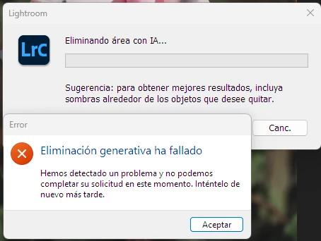 Hola, tengo problemas con IA Regenerativa al intentar borrar contenido de la imagen. El error que muestra es el siguiente: