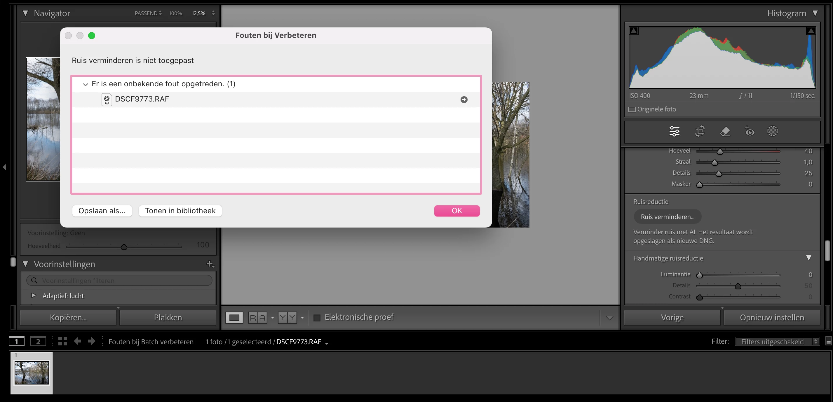 When I try to reduce noise in my pictures in Lightroom Classic, I get an error message. See the attachment to view the error message. Does anyone know what this might be related to?