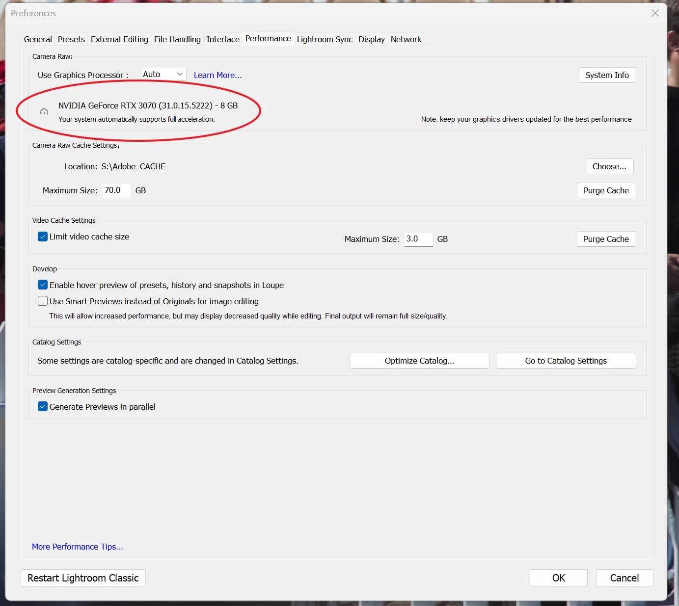 Second up, what does LrC say about your GPU? What is shown in /preferences/performance?