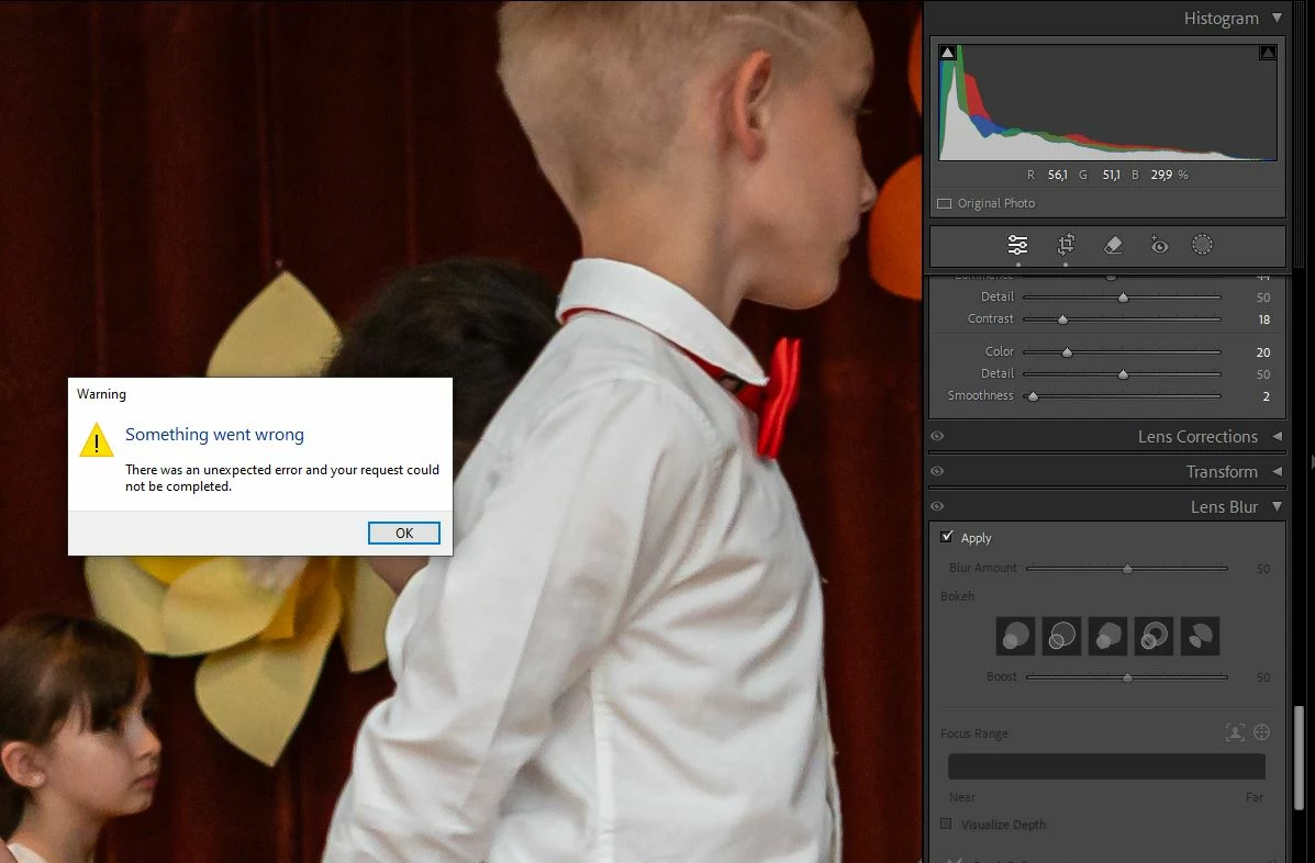 Has anyone experienced when applying Lens Blur in Adobe Lightroom 13.3 (Windows) cannot execute it?, display "Somethink When Wrong" as per attached screenshot.
