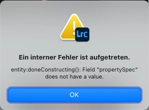 standard 19:37:26.956506+0100 Adobe Lightroom Classic Oops! An untagged string (entity:doneConstructing(): Field "propertySpec" does not have a value.) got thrown far enough that we display it to the user. This shouldn't happen.