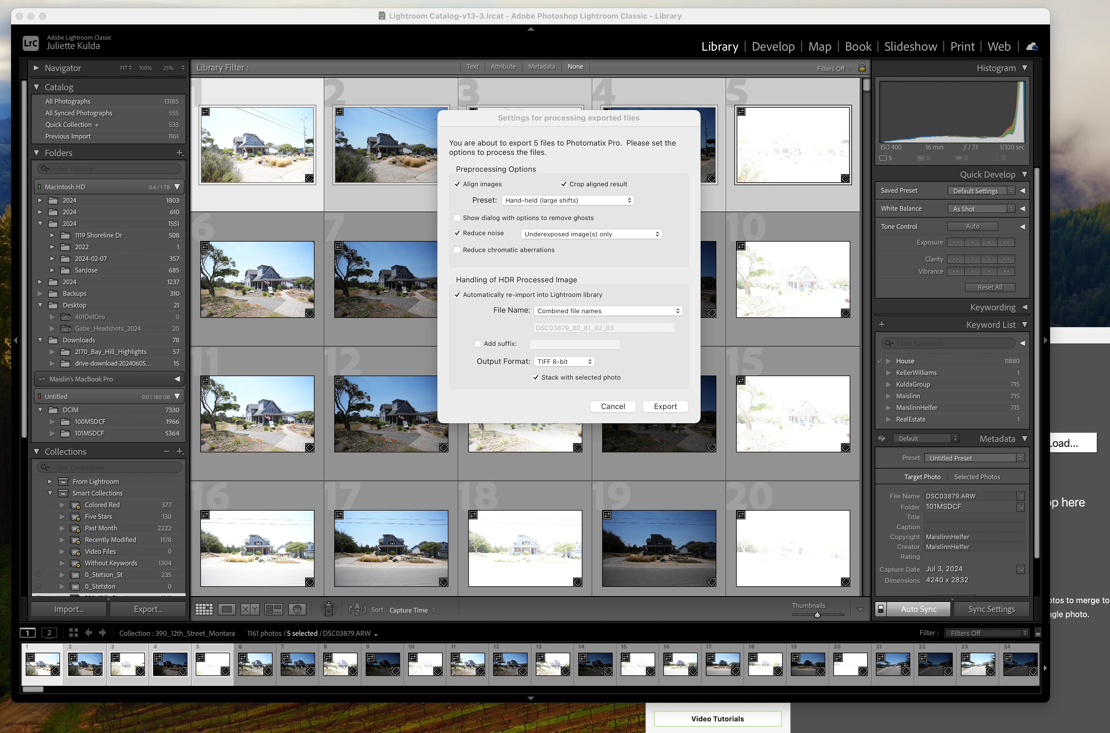 Below I will walk you through the steps of selecting 5 photos to export to Photomatix Pro 7 with screenshots of my settings in hopes this will help.