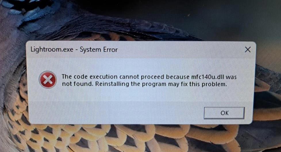 Lightroom.exe System error The code execution cannot proceed because mfc140u.dll was not found. Reinstalling the program may fix this problem.