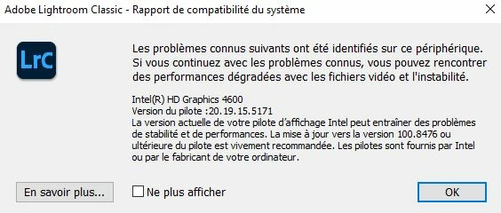 Errreur "Rapport de compatibilité du systeme" sur lightroom classic