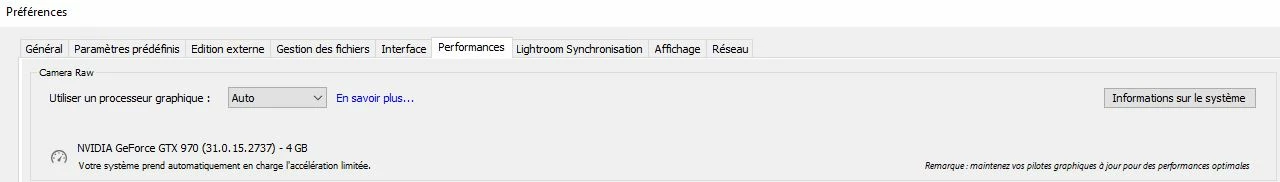 Je me retrouve depuis plusieurs semaines avec un message d'erreur "Rapport de compatibilité du systeme" lié au pilote de la carte graphique de ma carte intel HD graphique 4600 de base, alors même que Lightroom semble paramétré pour utiliser mon autre carte graphique, la NVDIA GTX970.