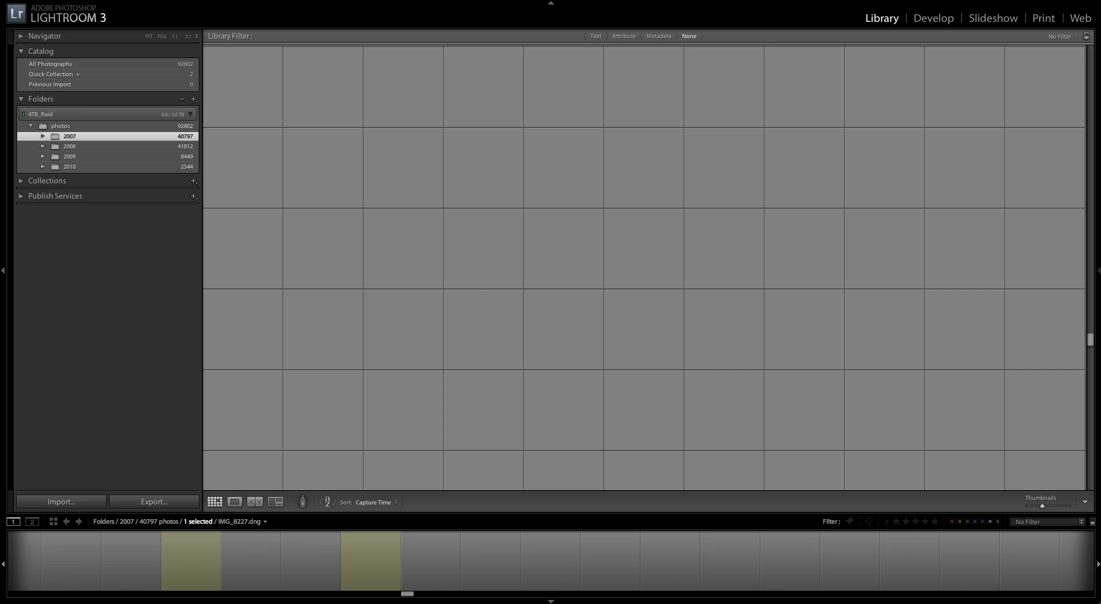 All of this leads me to wonder about any changes to thumbnail generation in LR3. My experience with LR2 was that it was necessary to go through my entire library and scroll the thumbnails on screen until the "..." to go away in order to get scrolling in Library Loupe or Grid view up to acceptable speeds. My initial impression of LR3 is that this isn't necessary.