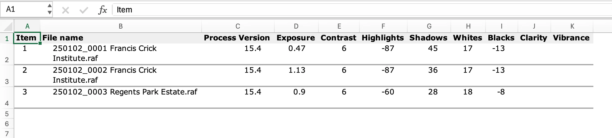 Is there a way to export develop settings for each photo in LRC to Excel or delimited file?