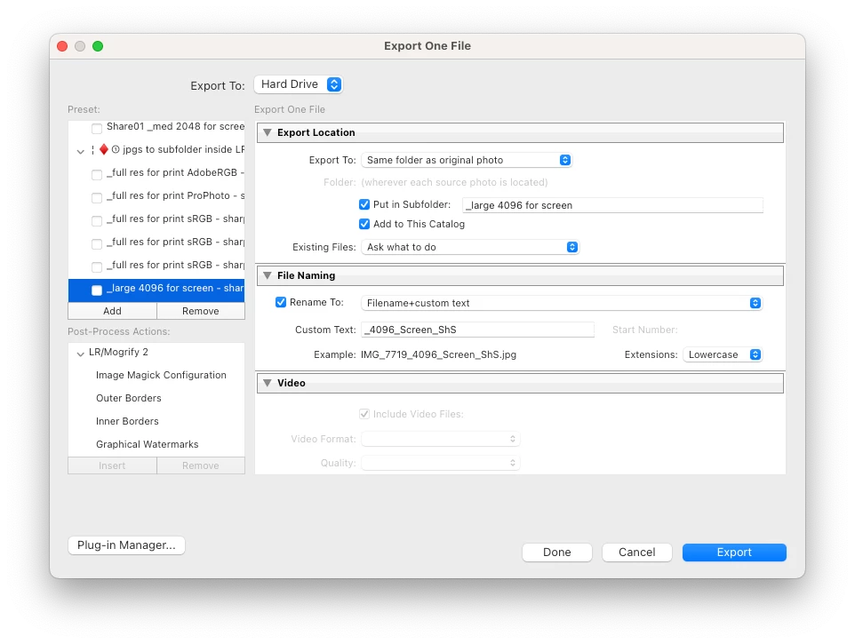 I'd like Lightroom to remember the last preset/settings I used when I go into the Export dialog but instead it continuously goes back to a specific one. I have folders full of presets so this is pretty annoying. Any ideas on how to fix this?