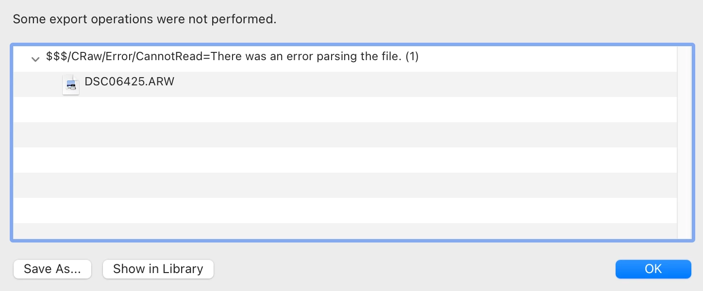 I've trying to export a RAW image taking on a Sony AR3 but getting a unable to read error when exporting.