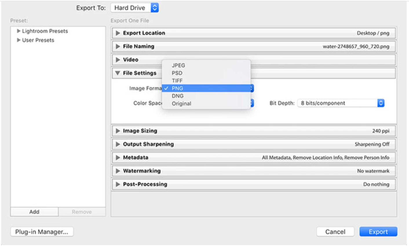 Is there any plugin for Lightroom for saving the PNG with transparent background. I have tried "Magic Export" plugin. When I export the PNG, it adds the -1 at the end of the file name. Which I don't want.