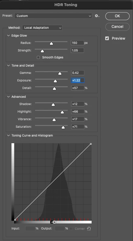 HDR editing. If you need true HDR output (that is, export to an HDR-capable file format), enable the HDR option that Adobe added in 2023. If you have a display that meets Adobe HDR requirements, you can now edit, preview, and output using HDR dynamic range, up to 4 stops beyond SDR. The histogram changes to clearly indicate the HDR range, and how your image tones and your display’s capabilities match up with that range. When you export a copy, this will also enable HDR-compatible export formats and settings. Read about how that works at this link:
