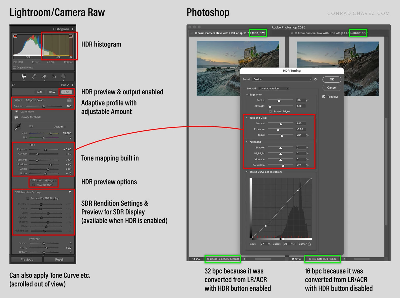 One last fun fact in the image below. I added the green boxes to point out a workflow difference: If you start tone mapping a raw file in Lightroom/Camera Raw with the HDR button enabled, then convert that to Photoshop for further editing, Lightroom/Camera Raw sends a 32 bits/channel image to Photoshop for optimal HDR editing. If the HDR button is disabled, Lightroom/Camera Raw sends a 16 bits/channel image to Photoshop.
