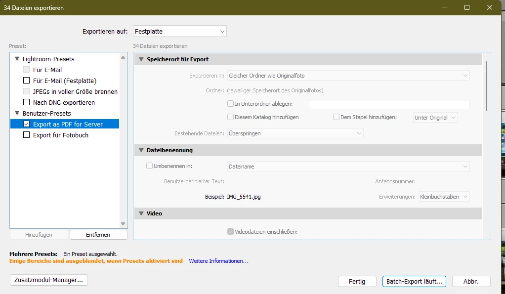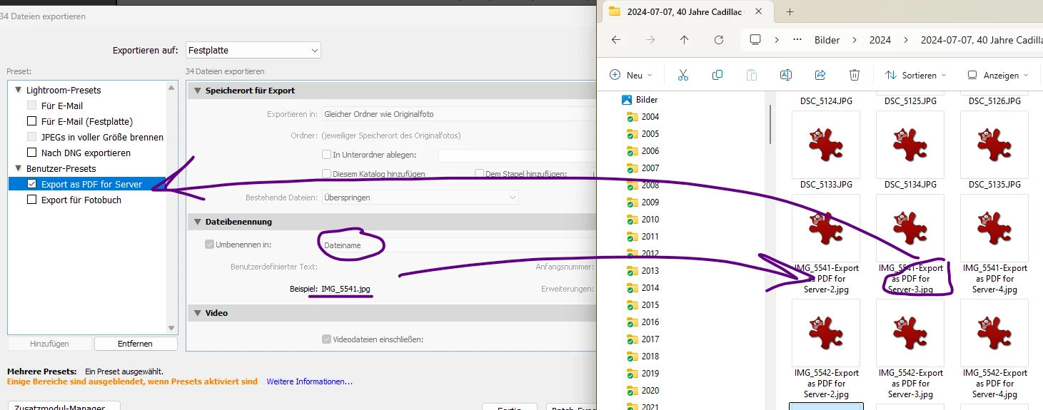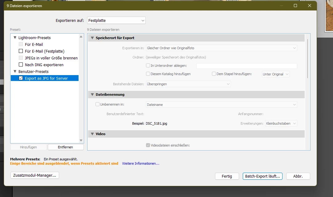 --> However, when I use this export a second time or when there are already files with identical filename, then the exsting files are not skipped but new files are exported with the name of the export preset attached to the filename.