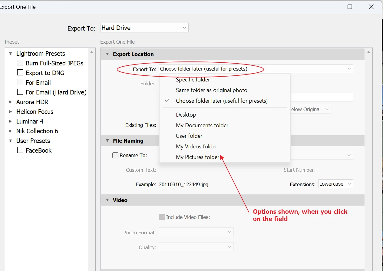I always use export with 'choose folder later'. Lightroom Classic lost a nice featere here. Some versions ago it would show the same folder that was used at the previous export. Very welcome like for re-exporting after some changes and also as start to navigate quickly to a new folder. Now that feature has been lost, which means that we have to navigate the whole folder-tree each time.