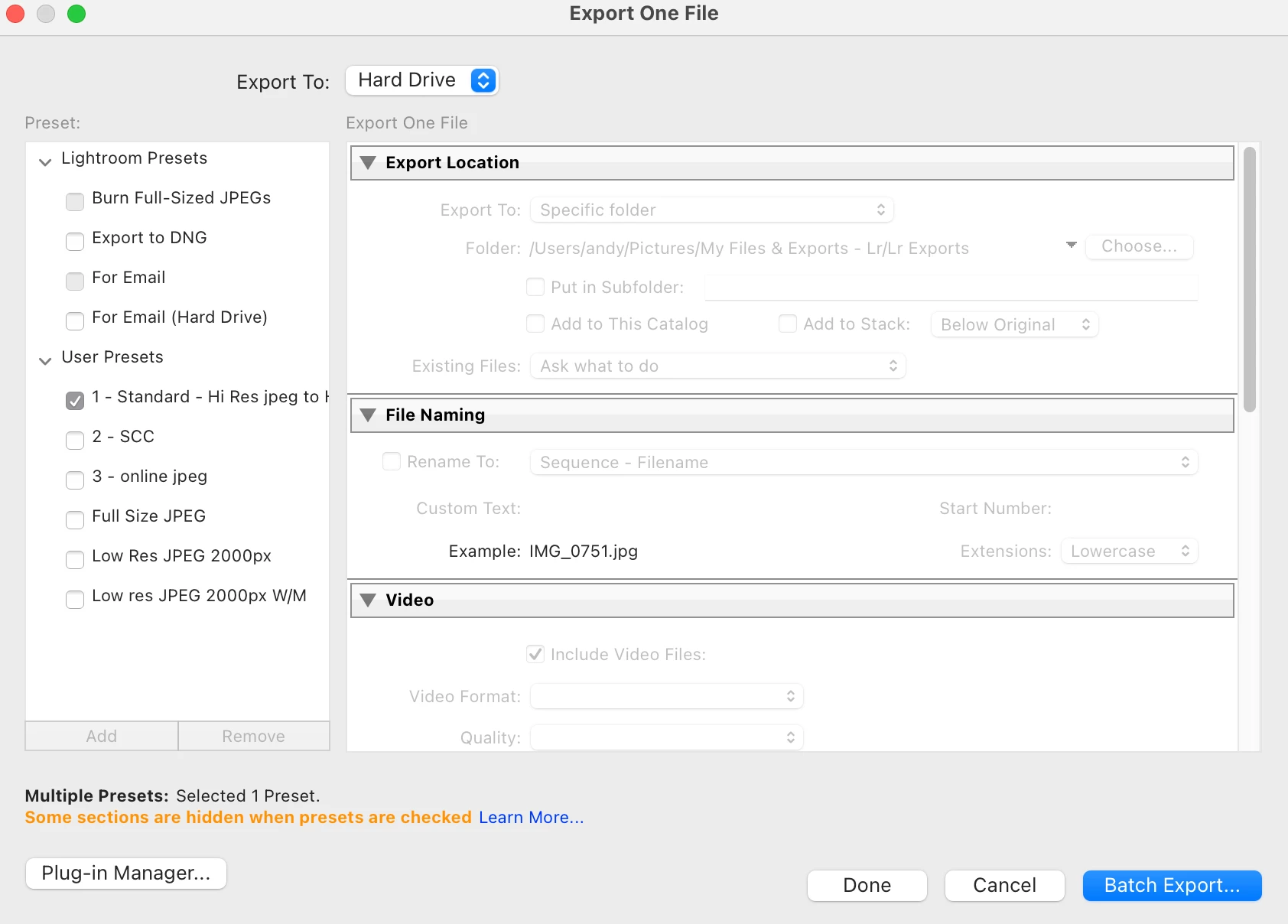 I'm having a problem exporting image(s). Lightroom presets seems to have selected 2 presets (boxes are greyed out and unresponsive) automatically. When I then select the user present I want to use, it comes up with a warning about multiple presets and batch exporting (it says "multiple presets: Select 1 preset). I only want to export one version using my user preset. Screen shot attached. Any ideas how to resolve this? I'm using Lr v12 and iMac running Monterey v12.6.2. I have previously managed to export successfully without this problem using the exact same set up and software / ios versions.