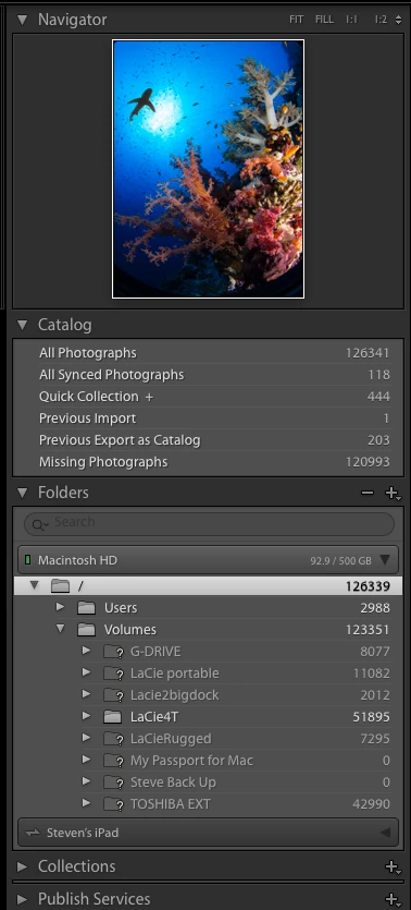 This is the screen that shows my 8 external drives as Volumes, not drives.. I'm still not sure if it even matters, but some of these drives are old, and I would like to move the contents to the 2BigDock drive.. sounds easy (it's 12TB) One of my 2TB drives (My Passport for Mac below) won't even get recognized by the laptop, even with disk utility.. so I assume it is bad(?) But in this screen capture, the Lacie2BigDock is greyed out (it's brand new) even though it is currently connected to the laptop. .thanks for your help :-)