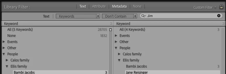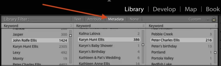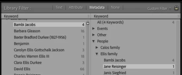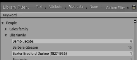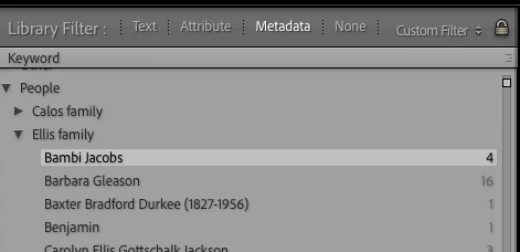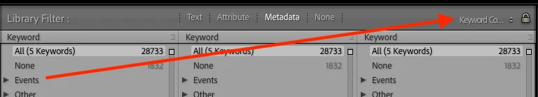 That opens the Library Filter bar's Metadata browser with a Keyword column having that keyword selected: