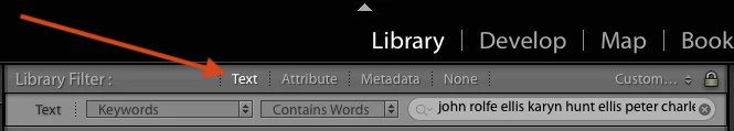 This will match those photos whose Keywords field contains all of the specified words (in this case, "john", "rolfe", "ellis", "karyn", "hunt", ...). This will get all of the desired photos but sometimes could also include undesired photos as well.  For example, if you searched for Keywords Contains Words "john ellis", that would match a photo containing the keywords "john tierney" and "ellis smith".