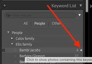 To see the photos with a particular Person keyword, hover the mouse over it and click the arrow on the right that magically appears: