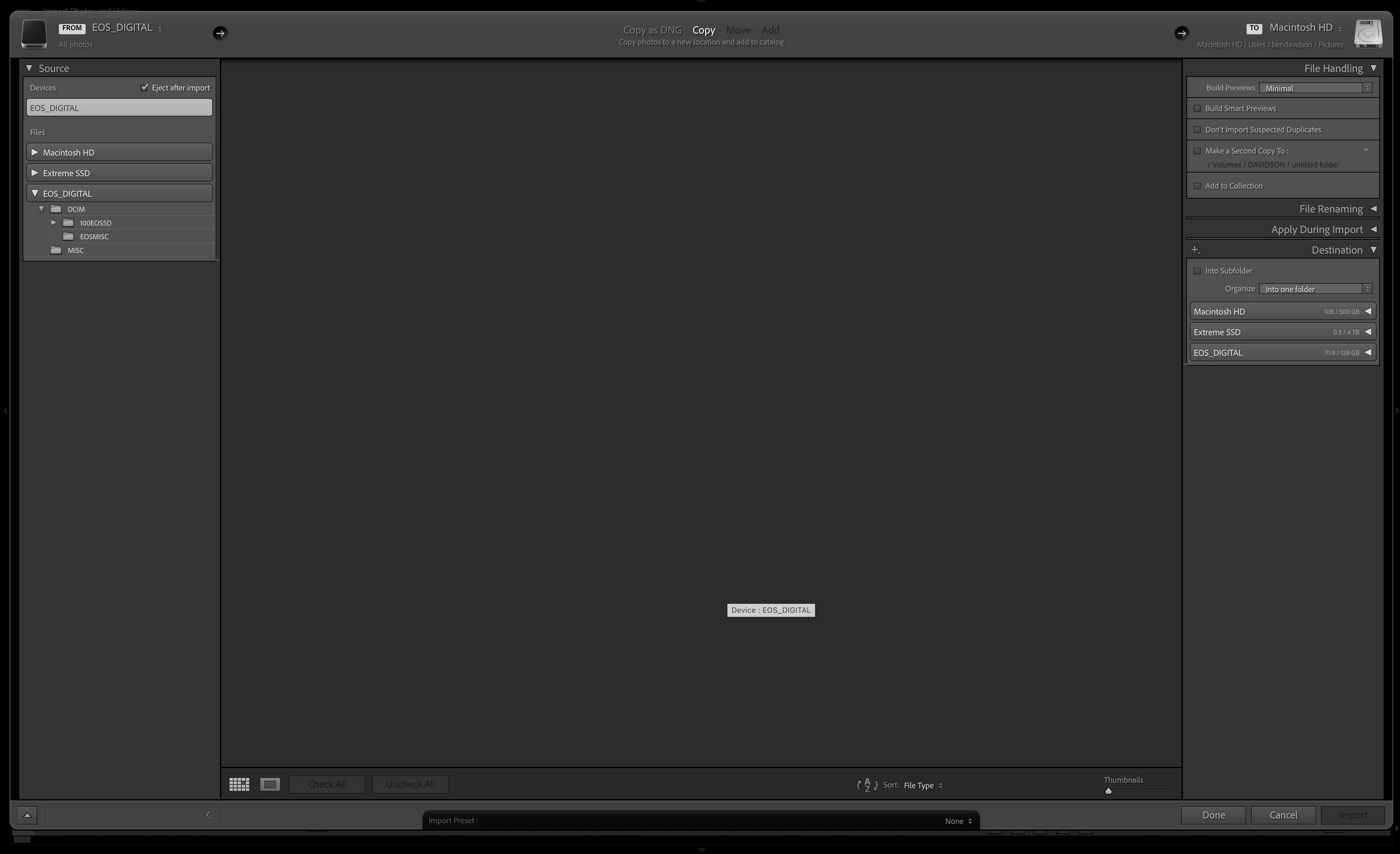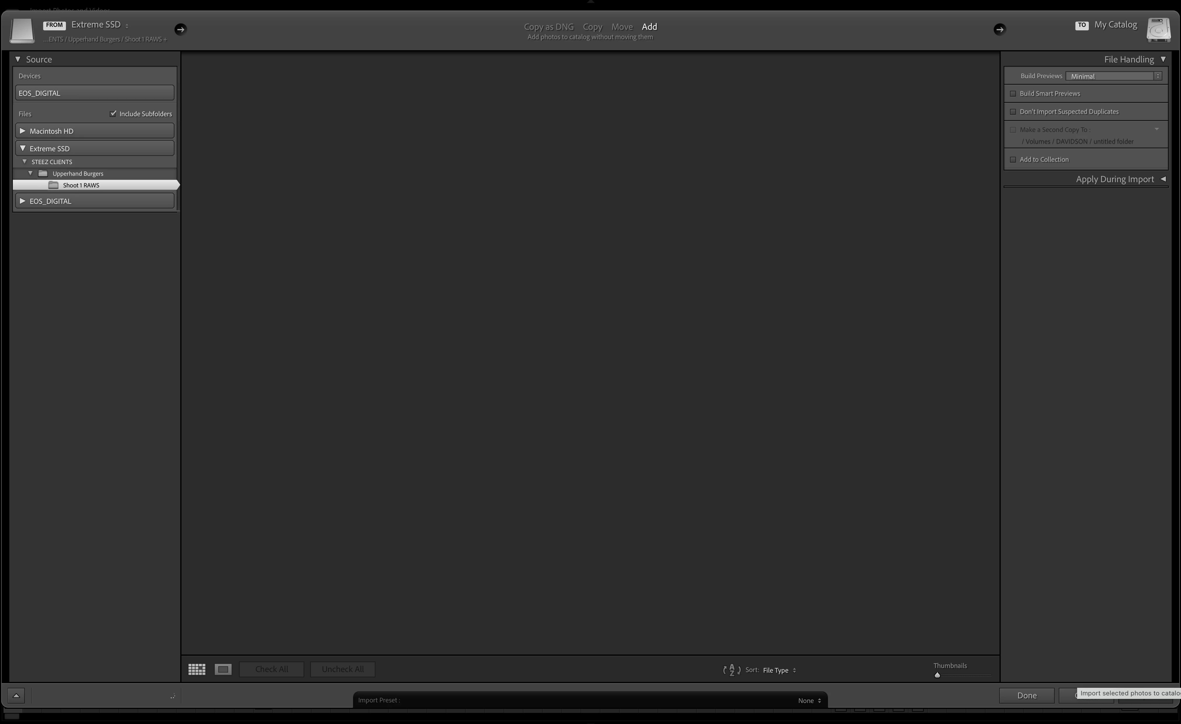 Currently having experiencing some pretty annyoying in issues with LRC. I can't seem to import photos into LR nor can I Add photos that are already on my SSD into the Library catalog. Neither action even displays photos in the import dialog. (import button is disabled, no grey boxes & no options of 'new photos' or 'all photos'.)