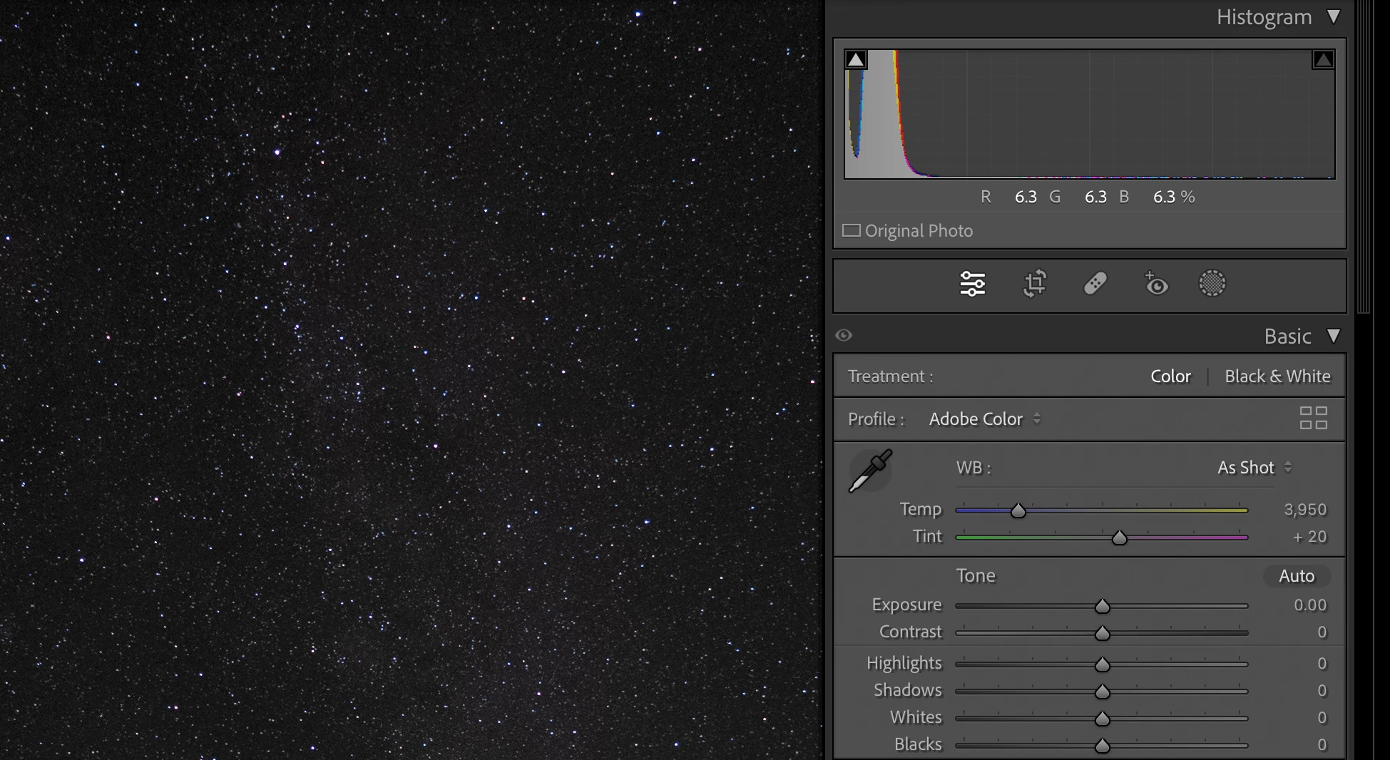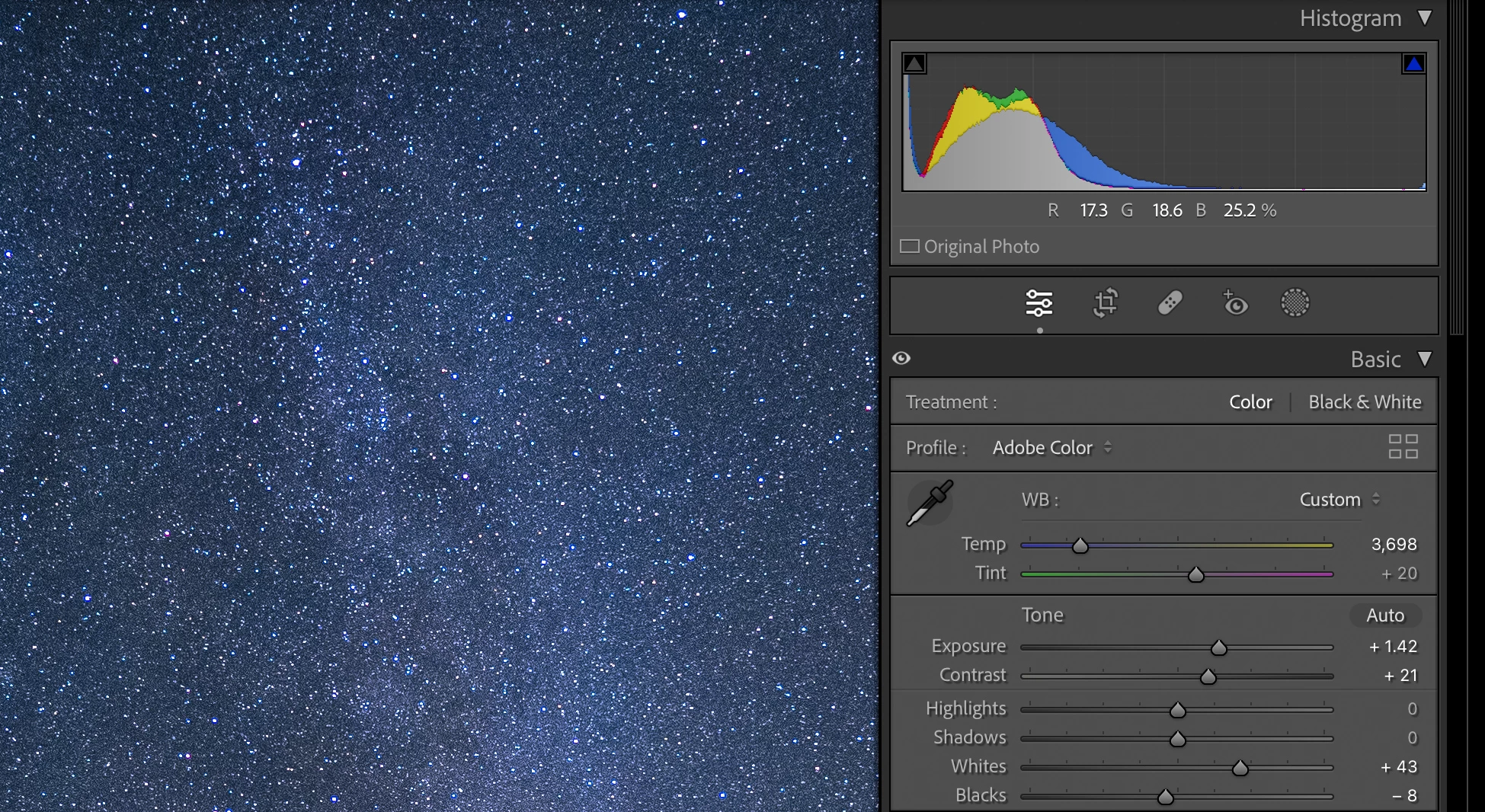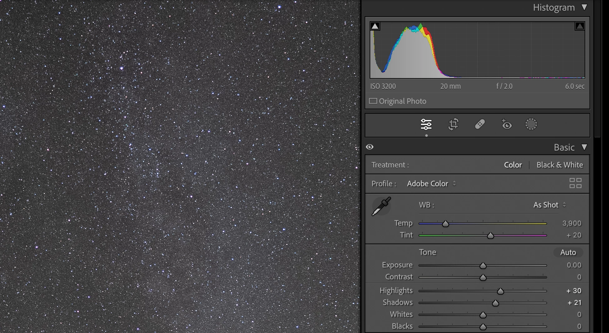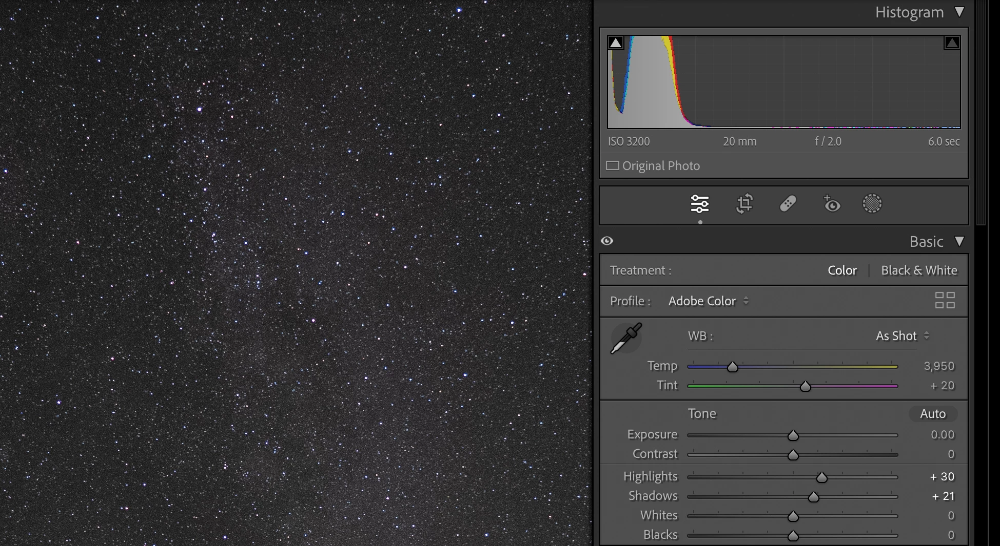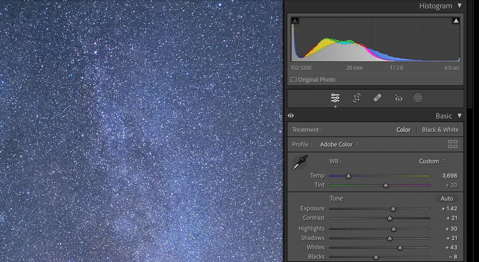 They were taken with the same settings just 105 seconds apart, and they look nearly identical, with nearly identical histograms. There are very small differences due to the rotation of the sky and the short streak of a satellite.