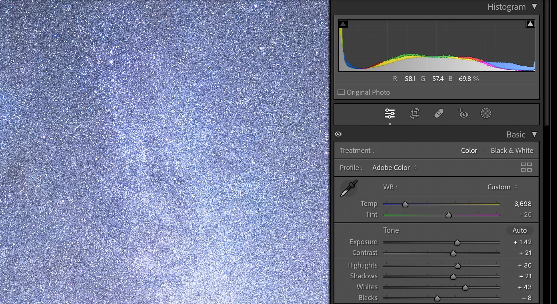 Conversely, if you reset all the source settings except Highlights and Shadows and then copy all the settings to the destination, the source and destination photos are much different, including their histograms:
