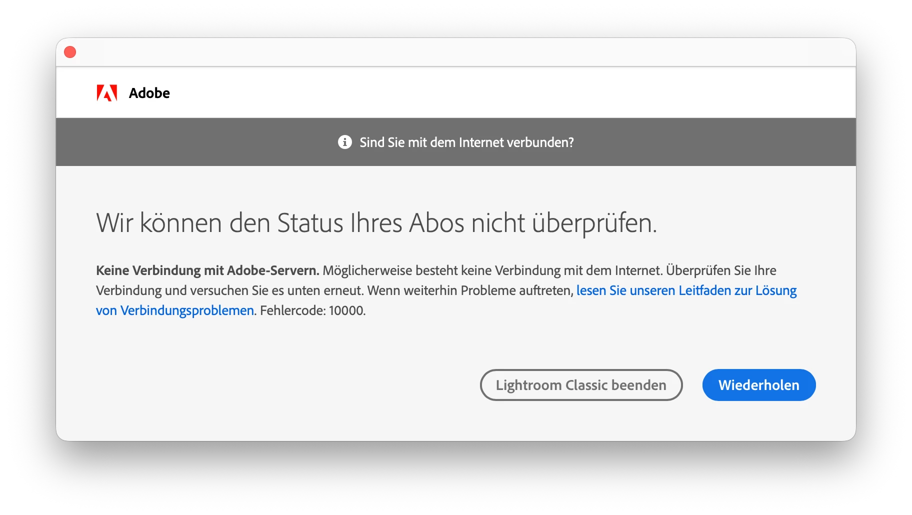 seit dem ich mein lightroom/photoshop abo von monatlich auf jahresabo umgestellt habe bekomme ich jedes mal nach dem start von lrc diese fehlermeldung: