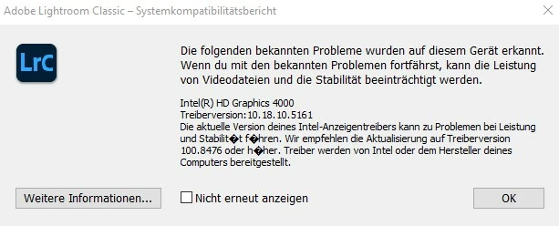 ich bekomme seit einiger Zeit bei Öffnen von LR Classic folgende Fehlermeldung. Und leider funktioniert LR auch nicht richtig. ZB friert das Bild ein, ich kann nichts zurücksetzen oder synchronisieren.