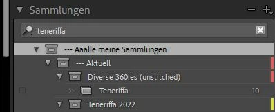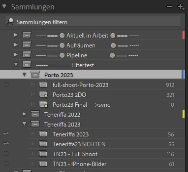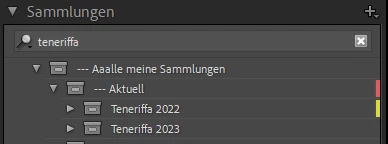 If I filter for "Teneriffa", "Porto", "2022", "2023" or for "collections marked yellow", I should get hits. However, the results list always remains empty. Here, for example, is the result when I filter for yellow collections:
