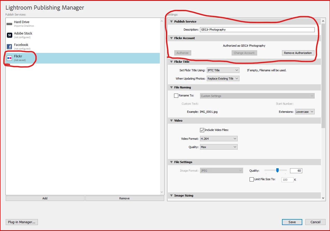 Flickr publish service shows unsaved.