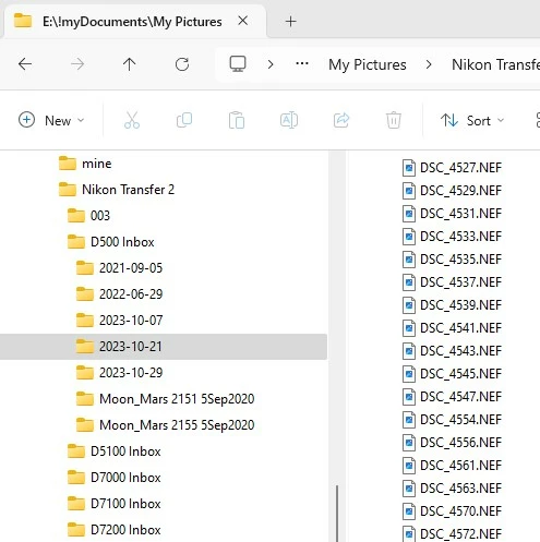 Hmm. I just tried to open an Import dialog to see what would happen. Seems I am able to navigate to the subfolders in the D500 subfolder of the Nikon Transfer folder and the images show up just fine. The import seems to have worked too with the Import preset that came over with the move tothe new computer.