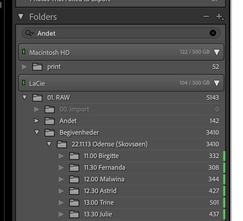 I'm no longer able to search my folders. Nothing happens when I type a folder name in the search bar. As you can see I tried "Andet" which is a folder I have, but it just keep showing all folders.