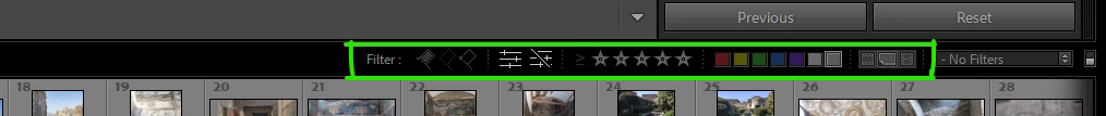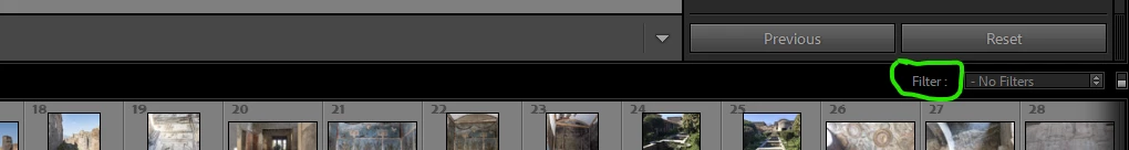 and next to that, a menu lets you select any custom named filter preset you may have saved. This immediately applies to Filmstrip (all modules) as well as to the Library Grid view, working from the starting point of whatever is the currently chosen Source.