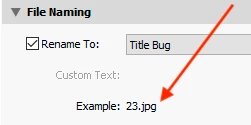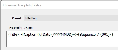 The title with such a numerical format is ignored when I edit the Rename Preset like {title}-{caption},{date}-{sequence}.When I leave out title in the previous string, the rename works ( obviously with just caption,date and sequence).